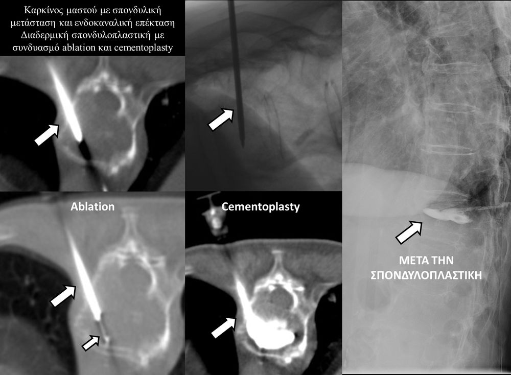 Η τεχνική της διαδερμικής σπονδυλοπλαστικής αφορά την απεικονιστικά καθοδηγούμενη, διαδερμική τοποθέτηση βελόνας εντός του σπονδυλικού σώματος και την υπό συνεχή ακτινοσκοπικό έλεγχο ενδοσπονδυλική έγχυση ακτινοσκιερού, πολυμερούς τσιμέντου (cementoplasty). Oι ενδείξεις της μεθόδου περιλαμβάνουν οστεοπορωτικά και τραυματικά κατάγματα, σπονδυλικές μεταστάσεις, πολλαπλούν μυέλωμα και λέμφωμα.