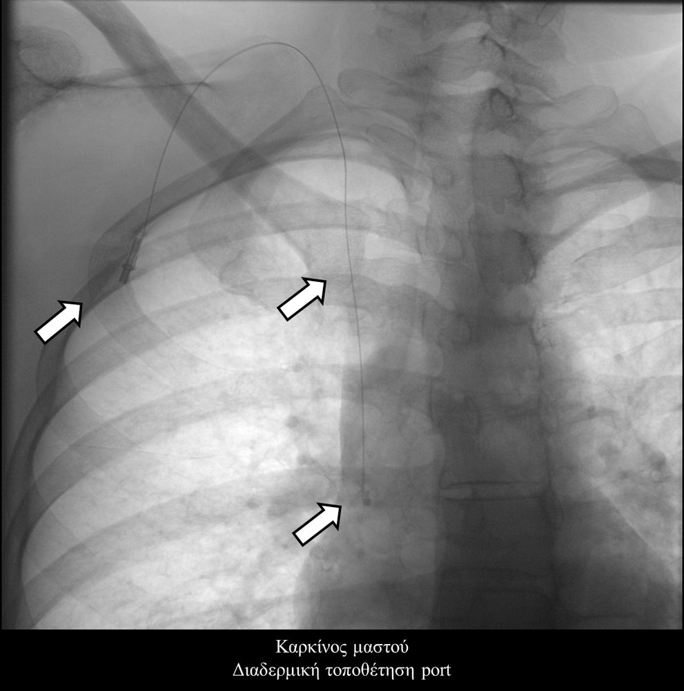 • Τα Port-a-Caths είναι εμφυτεύσιμοι κεντρικοί φλεβικοί καθετήρες με τύμπανο που τοποθετούνται διαδερμικά συνηθέστερα στο πρόσθιο θωρακικό τοίχωμα και ενώνονται μέσω υποδόριου τούνελ με την έσω σφαγίτιδα φλέβα. Η τοποθέτησή τους γίνεται στην αγγειογραφική σουίτα σε συνθήκες αποστείρωσης και με τη βοήθεια υπερηχογραφικού ελέγχου. Το Port-a-Cath είναι μια υποδόρια συσκευή, που δεν περιορίζει τις καθημερινές δραστηριότητεςκαι δεν απαιτεί συχνή φροντίδα. Ο ογκολογικός ασθενής μπορεί να κάνει άφοβα μπάνιο ακόμα και στη θάλασσα. Οι κίνδυνοι επιμόλυνσης και  θρόμβωσης του καθετήρα είναι πολύ χαμηλοί, ενώ η διάρκεια χρήσης του μπορεί να ξεπεράσει και τα 5 έτη. Επιπλέον ενδείκνυται η χρήση τους σε αξονικούς και μαγνητικούς τομογράφους έως 1.5 Tesla.