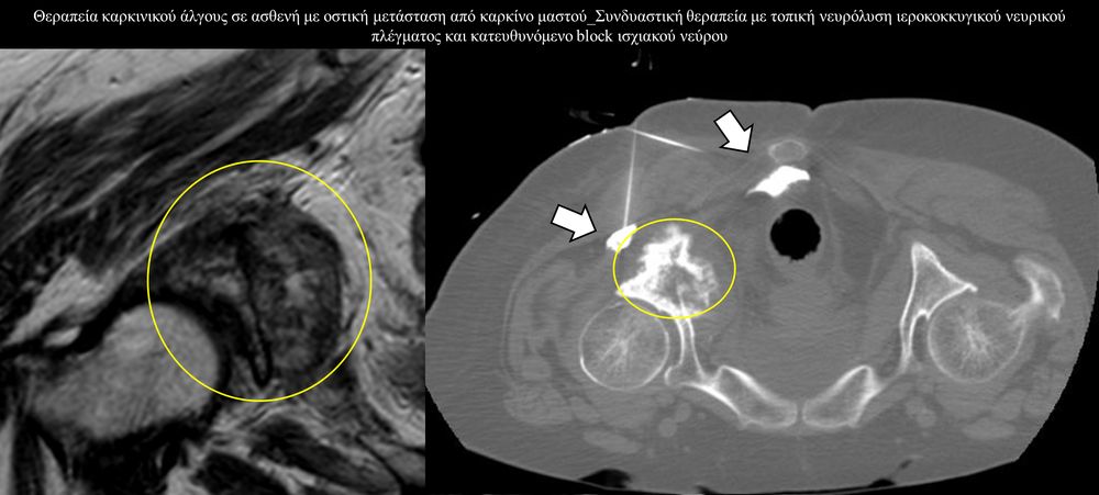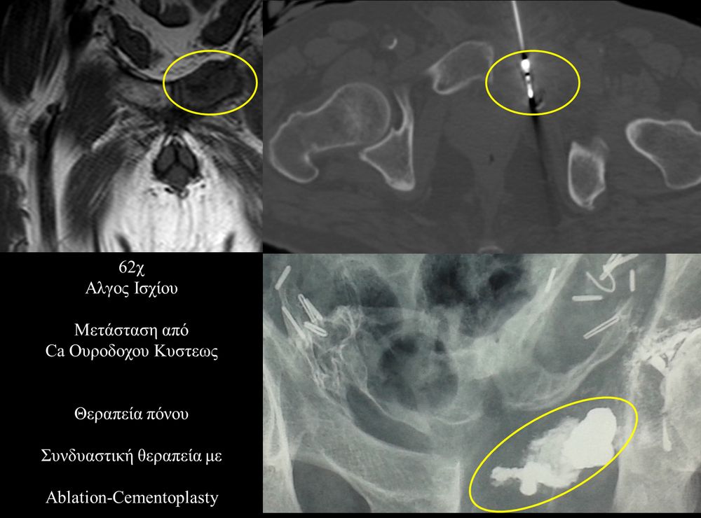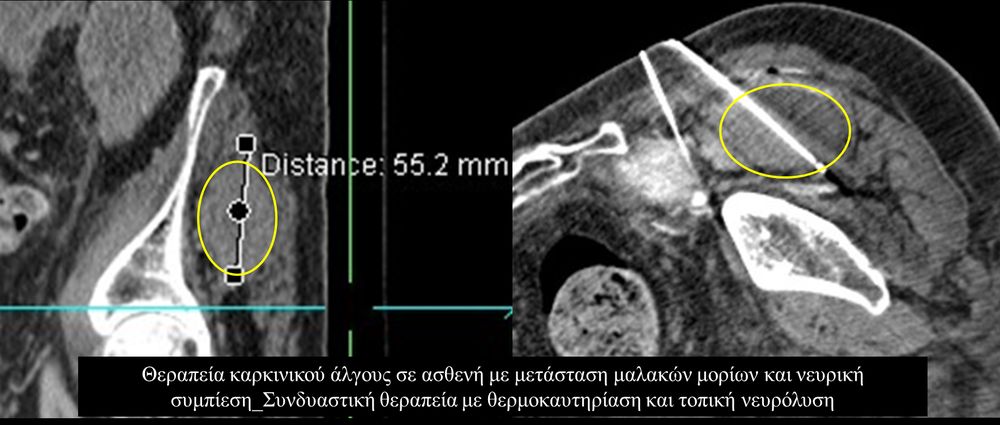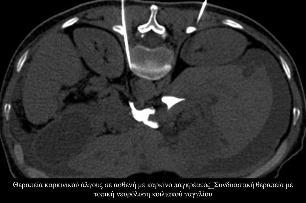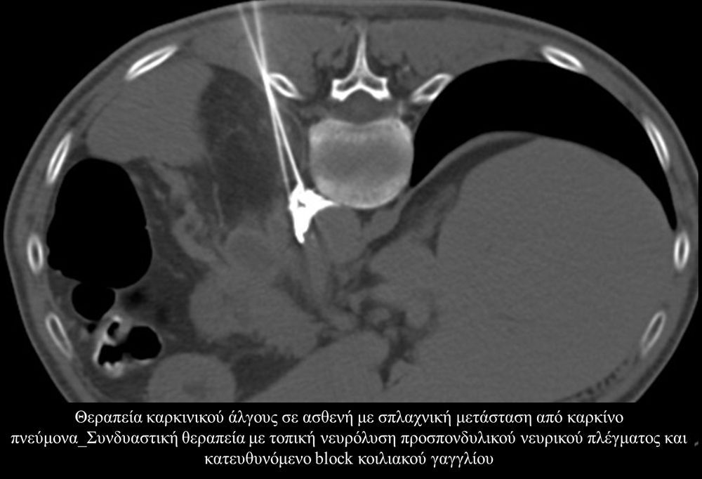 Η αντιμετώπιση του καρκινικού πόνου, εκτός από την κλασική συντηρητική φαρμακευτική θεραπεία, όταν ο πόνος επιμένει ή όταν οι παρενέργειες των φαρμακευτικών μεθόδων εξαντλούν τον ασθενή, περιλαμβάνει ελάχιστα παρεμβατικές τεχνικές με τις οποίες επιτυγχάνεται διακοπή ή καταστροφή της νευρικής οδού μεταβίβασης του πόνου. Η επεμβατική ακτινολογία διαθέτει μια πληθώρα θεραπευτικών τεχνικών που σκοπό έχουν να προσφέρουν ποιοτική βελτίωση της ζωής και των σχέσεων, τόσο των ογκολογικών ασθενών, όσο και των οικογενειών τους.
